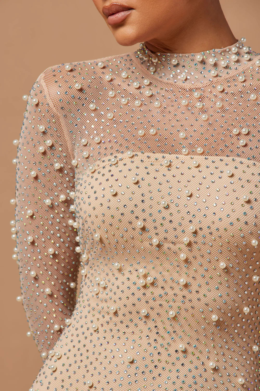 Pearl Love is a form-fitting, floor length dress that exudes elegance and sophistication. The sheer fabric is embellished with delicate pearls, making it a true statement piece. Perfect for any special occasion, this dress is sure to turn heads and leave a lasting impression.